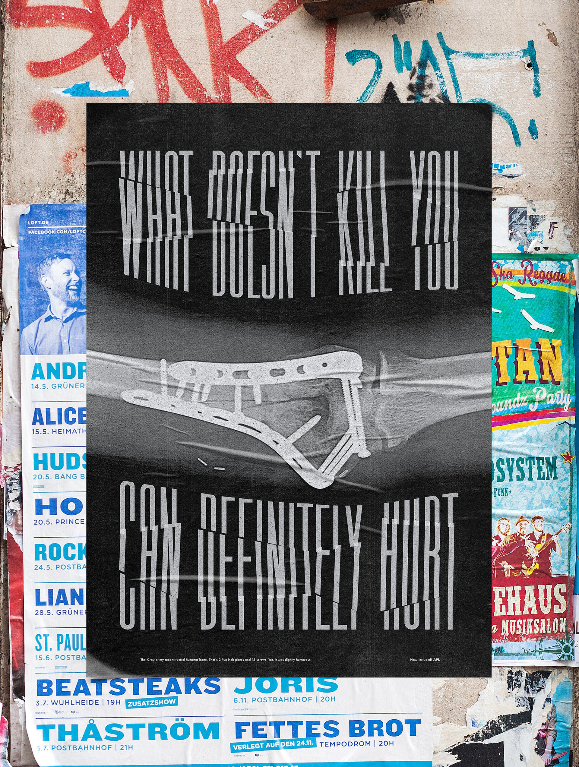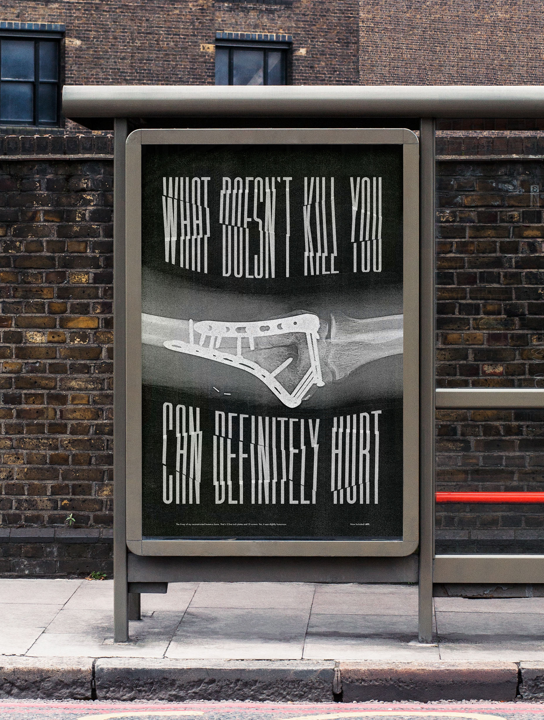 This is the X-ray of my reconstructed humerus bone turned into a poster. What you’re seeing is a “V” shaped fracture with (2) five-inch plates and (15) screws