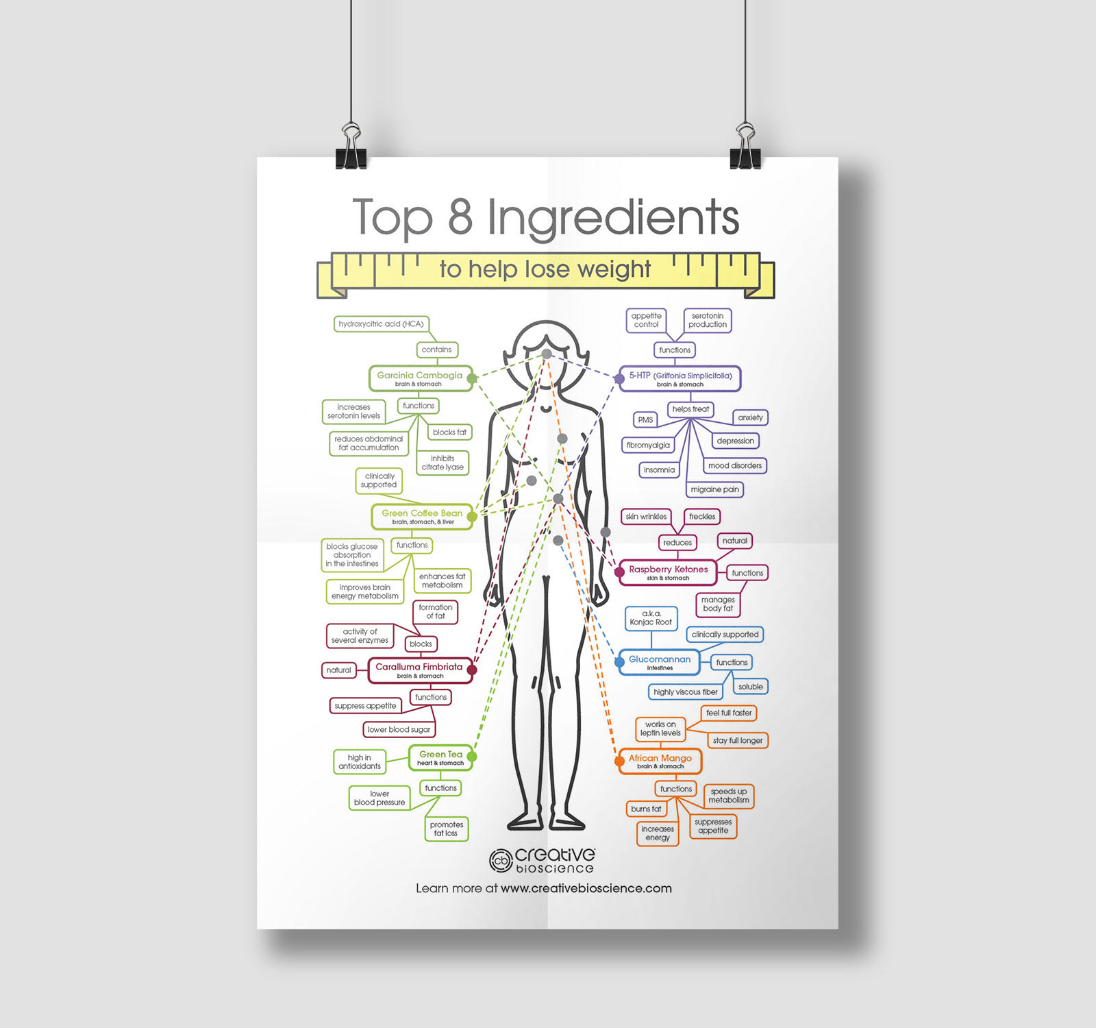 While employed at Creative Bioscience, I was tasked with creating an infographic that communicated information about the top 8 ingredients for weight loss, all of which they utilized in their dietary supplements.